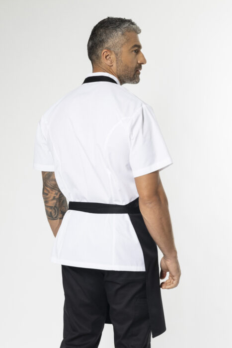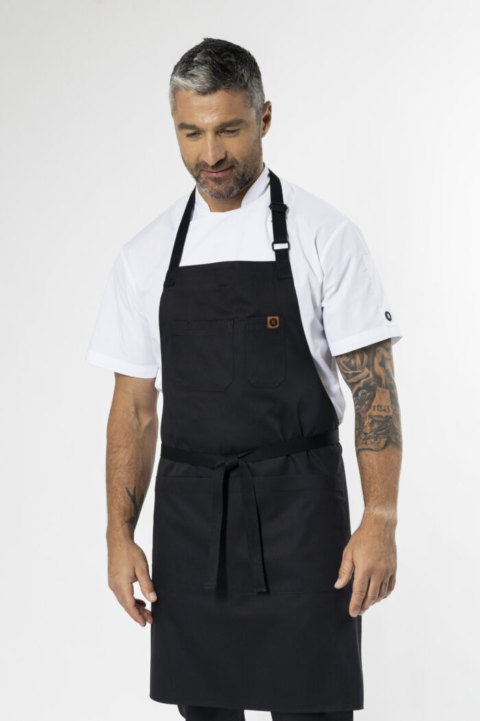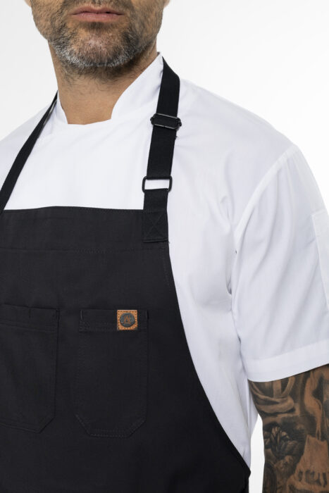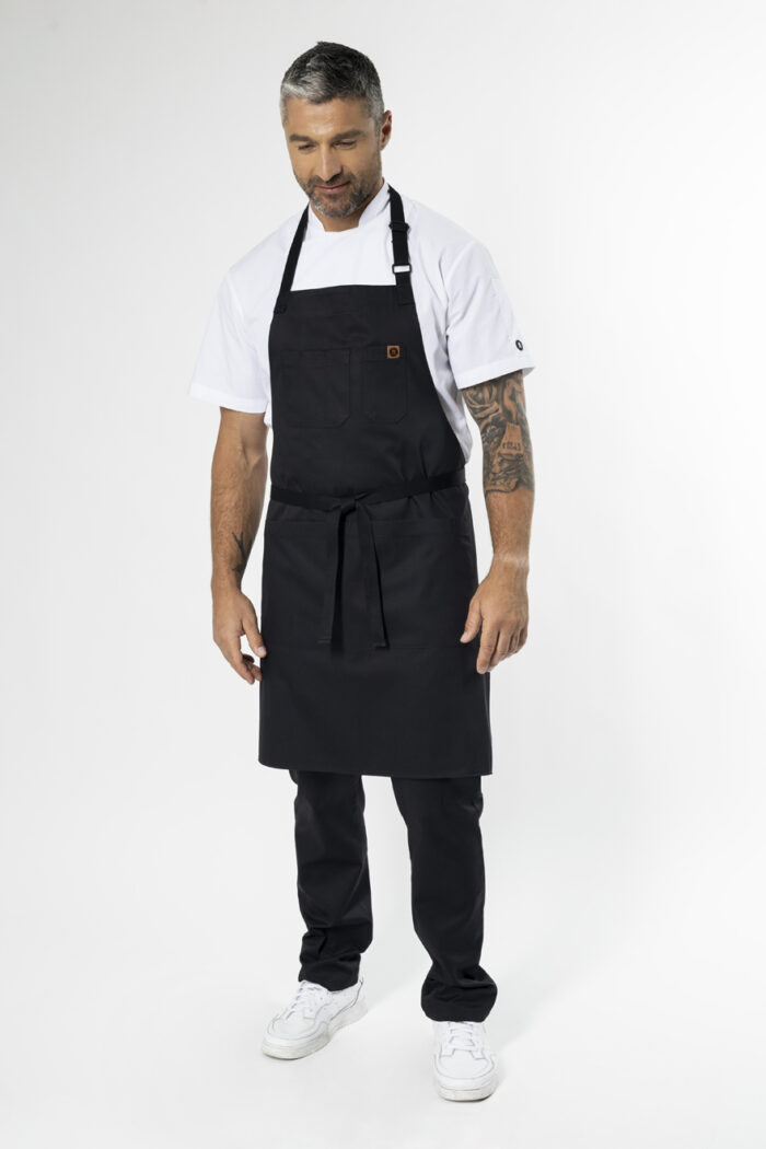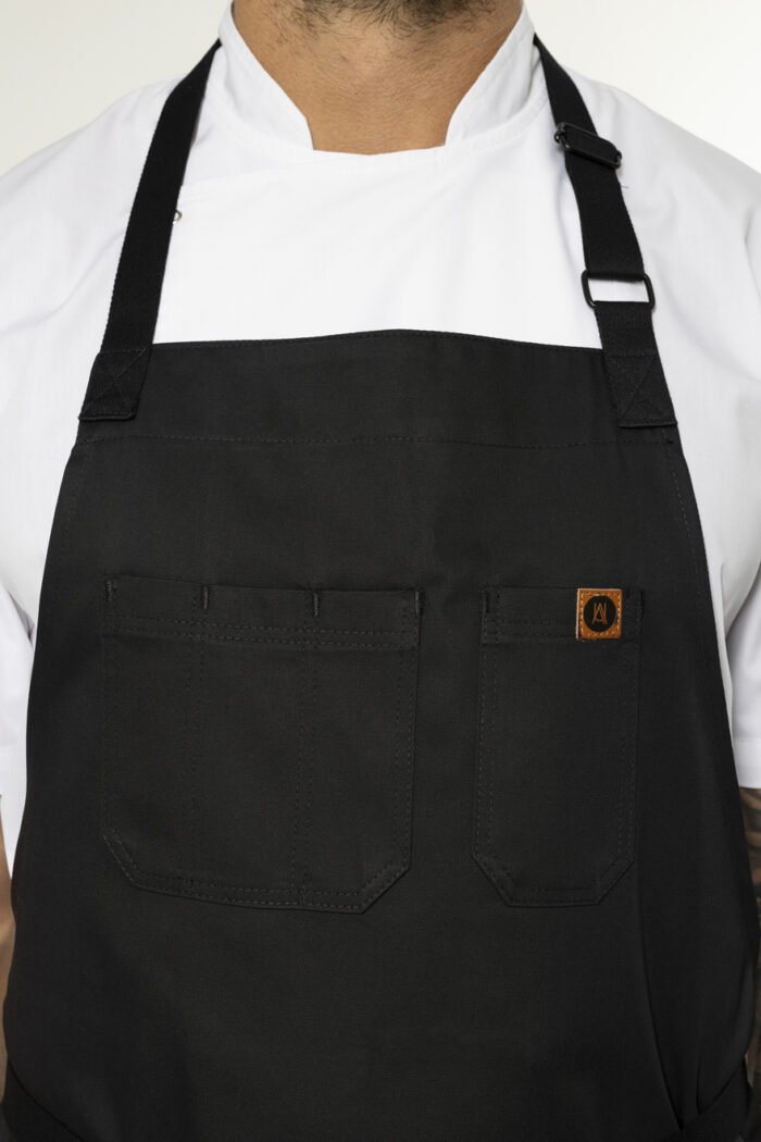 Adjustable neck strap with buckle, two chest pockets, one large lower pocket, cotton/acrylic webbing ties and neck strap. Bar tack stitching, black hardware.