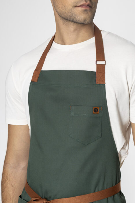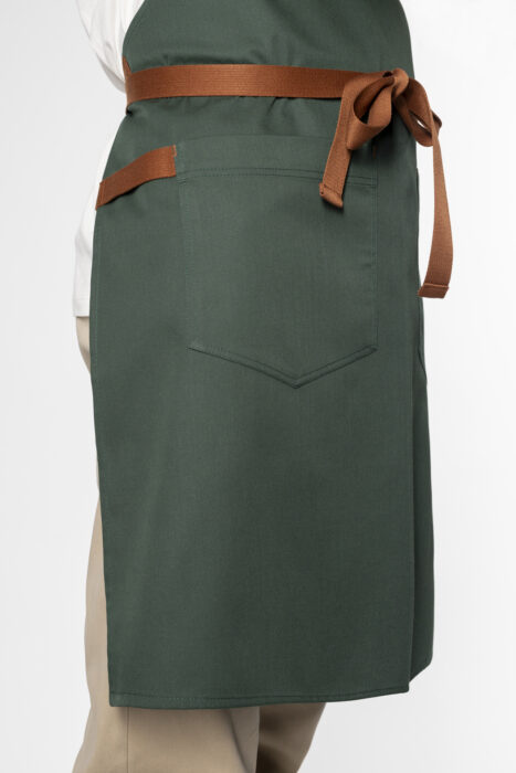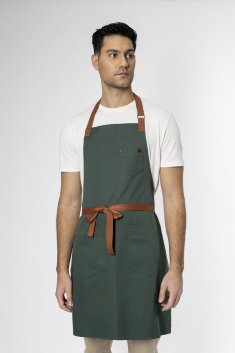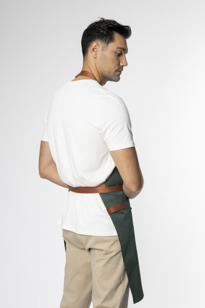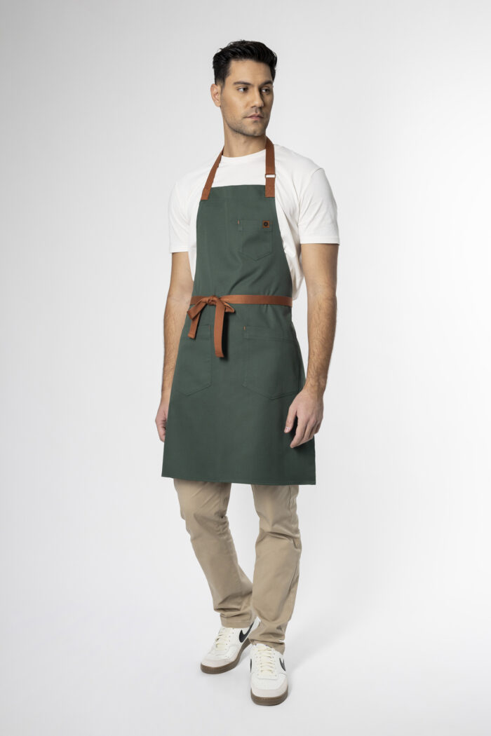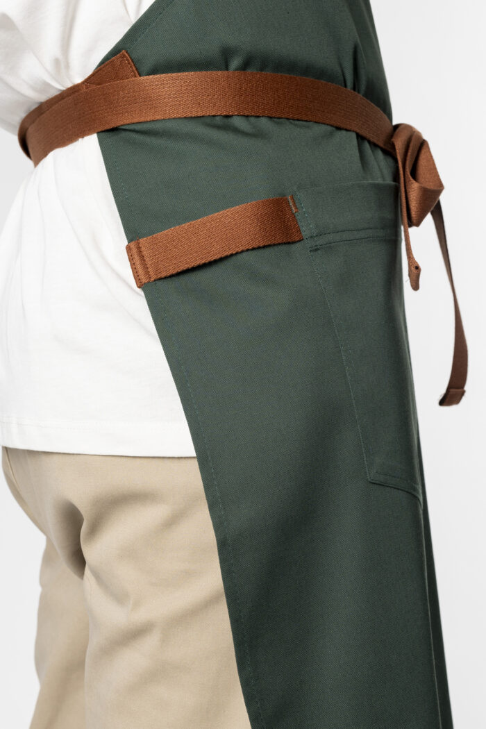 Chest pocket, two lower pockets, cotton/acrylic webbing ties and neck strap.