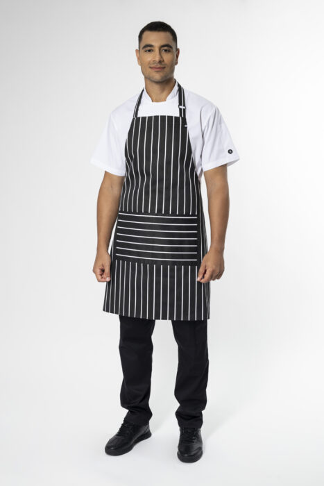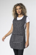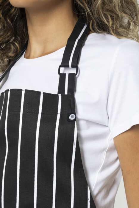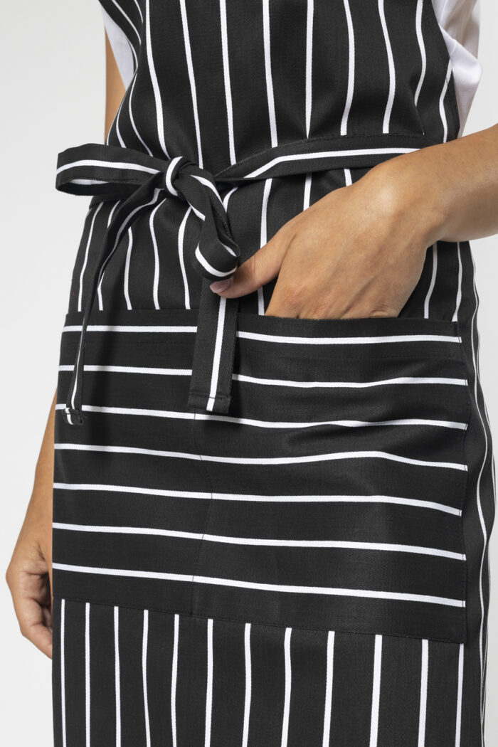 Adjustable neck strap, black buckle, large lower pocket with division, self fabric ties.