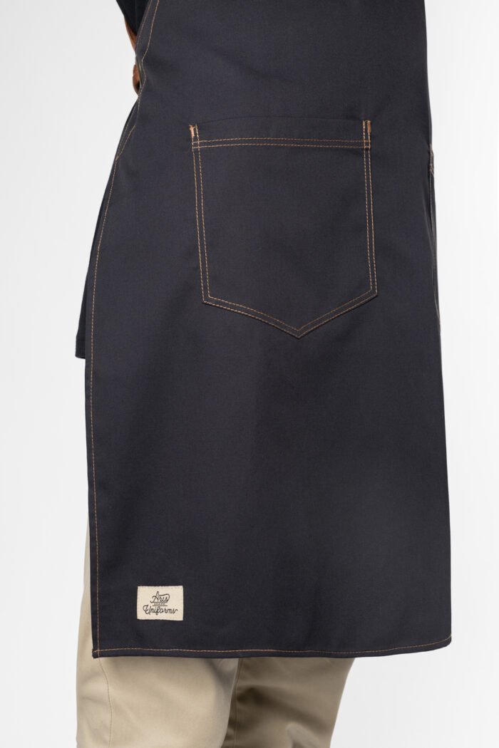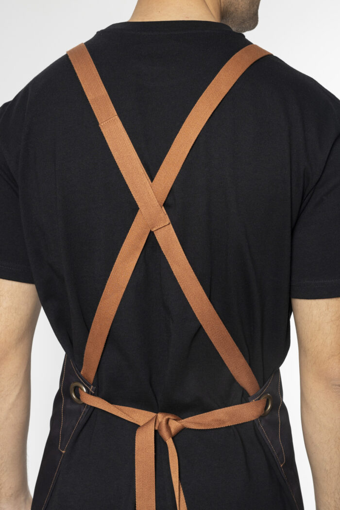 Crossback cotton webbing straps, antique copper rivets, chest pocket, two lower patch pockets.