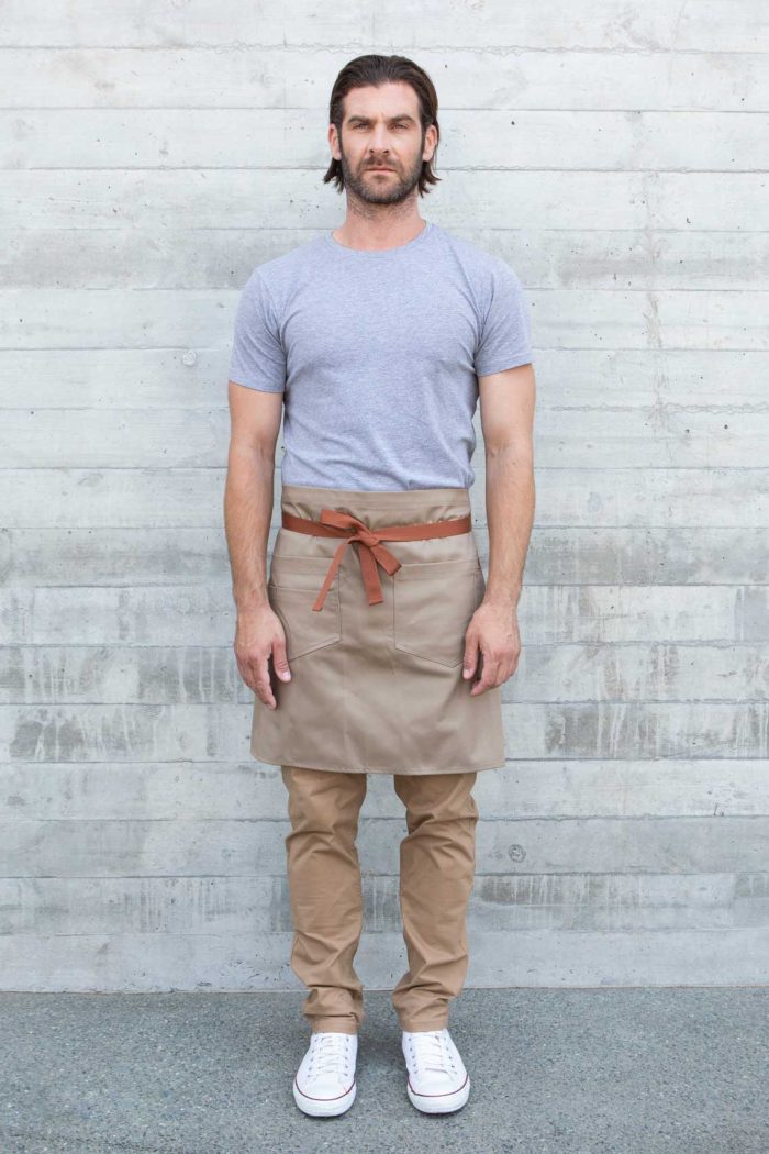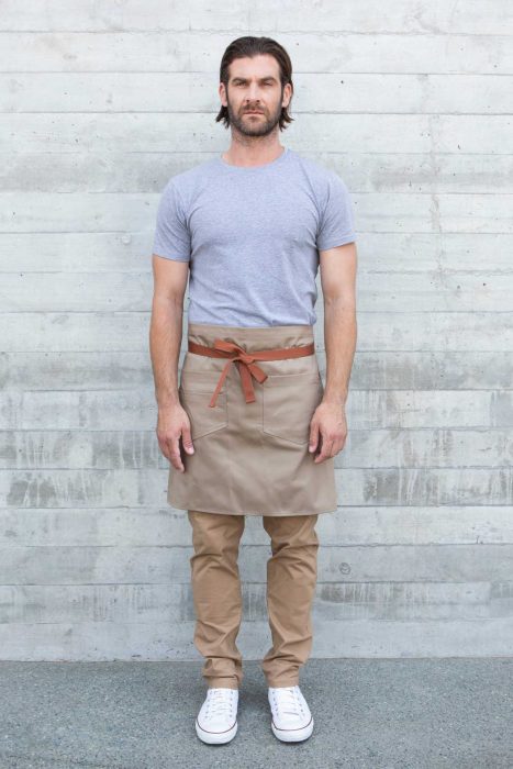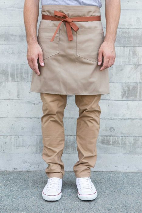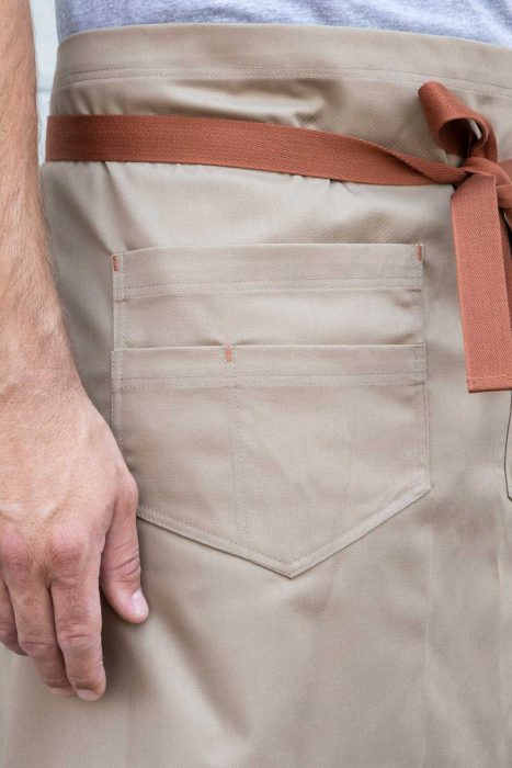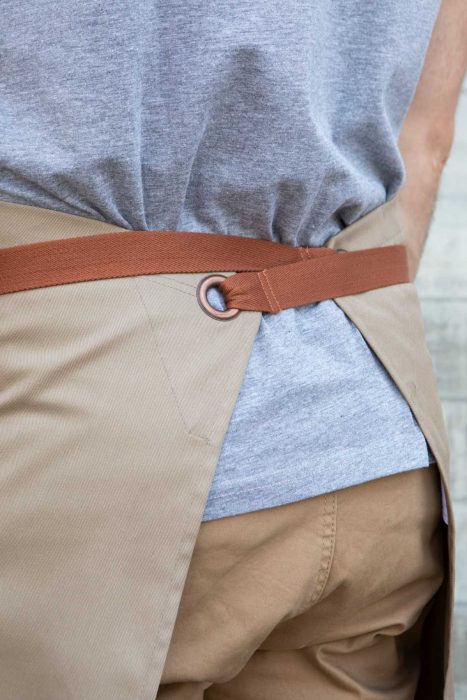 Two patch pockets with divisions, cotton webbing ties and brass eyelets.