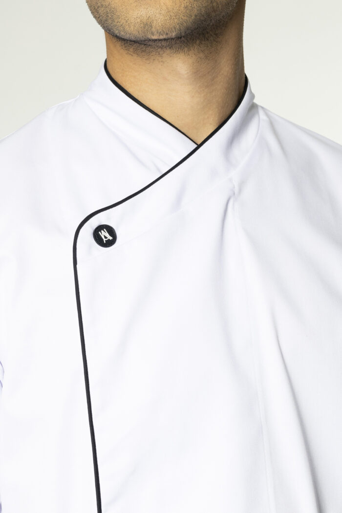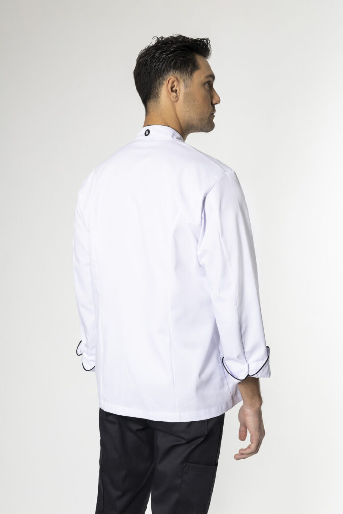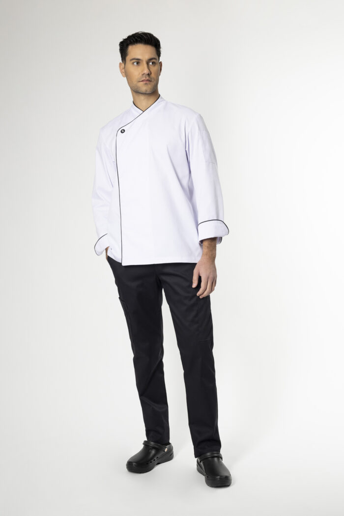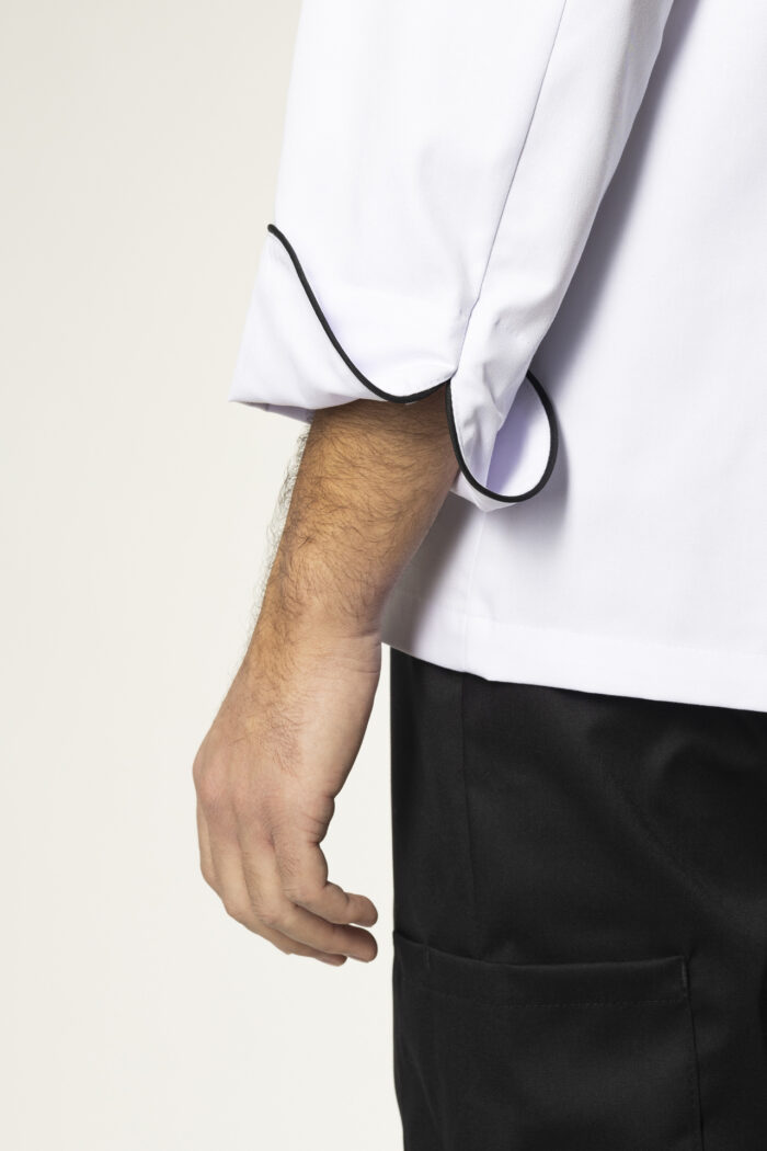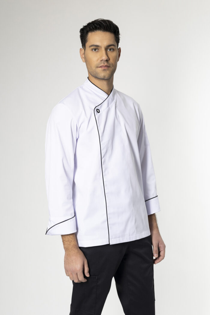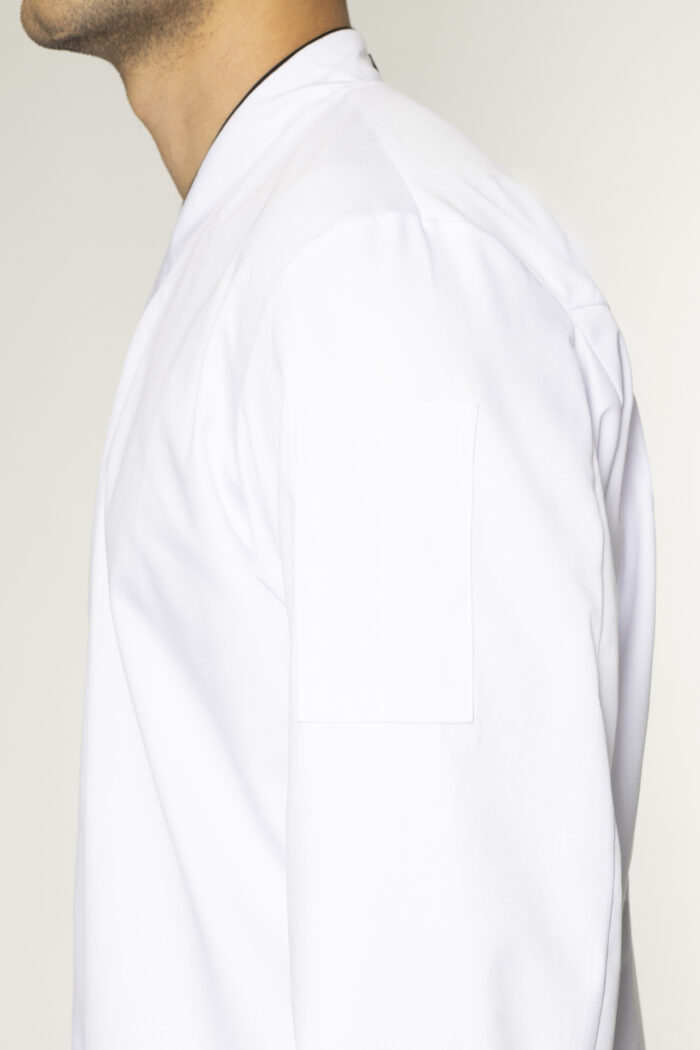 Asymmetrical design with contrast trim along collar, front panel and cuffs. Concealed snap fastening. Long sleeve with turn back cuffs, sleeve pocket.