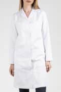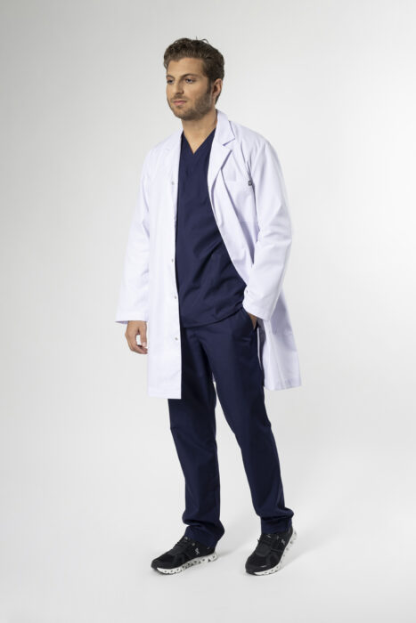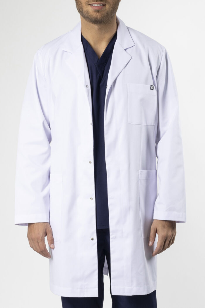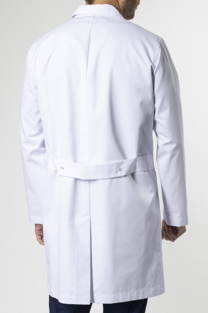 Long sleeve, flat collar, snap fastening. Adjustable back belt, one chest