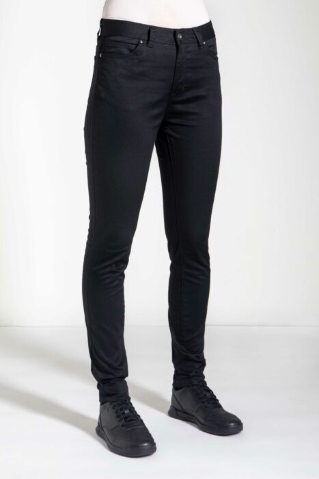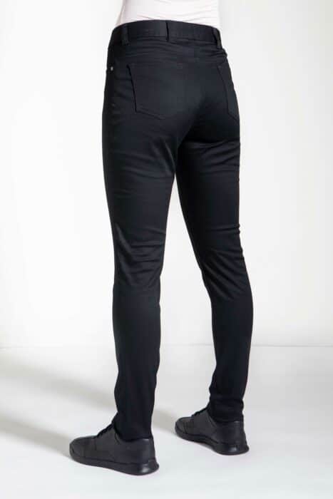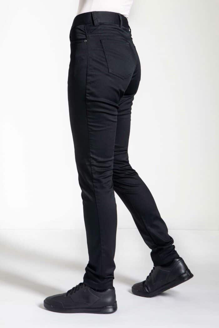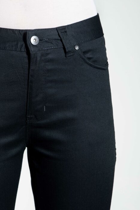 Button and zip front, belt loops, two side pockets with rivet detail. Silver hardware.