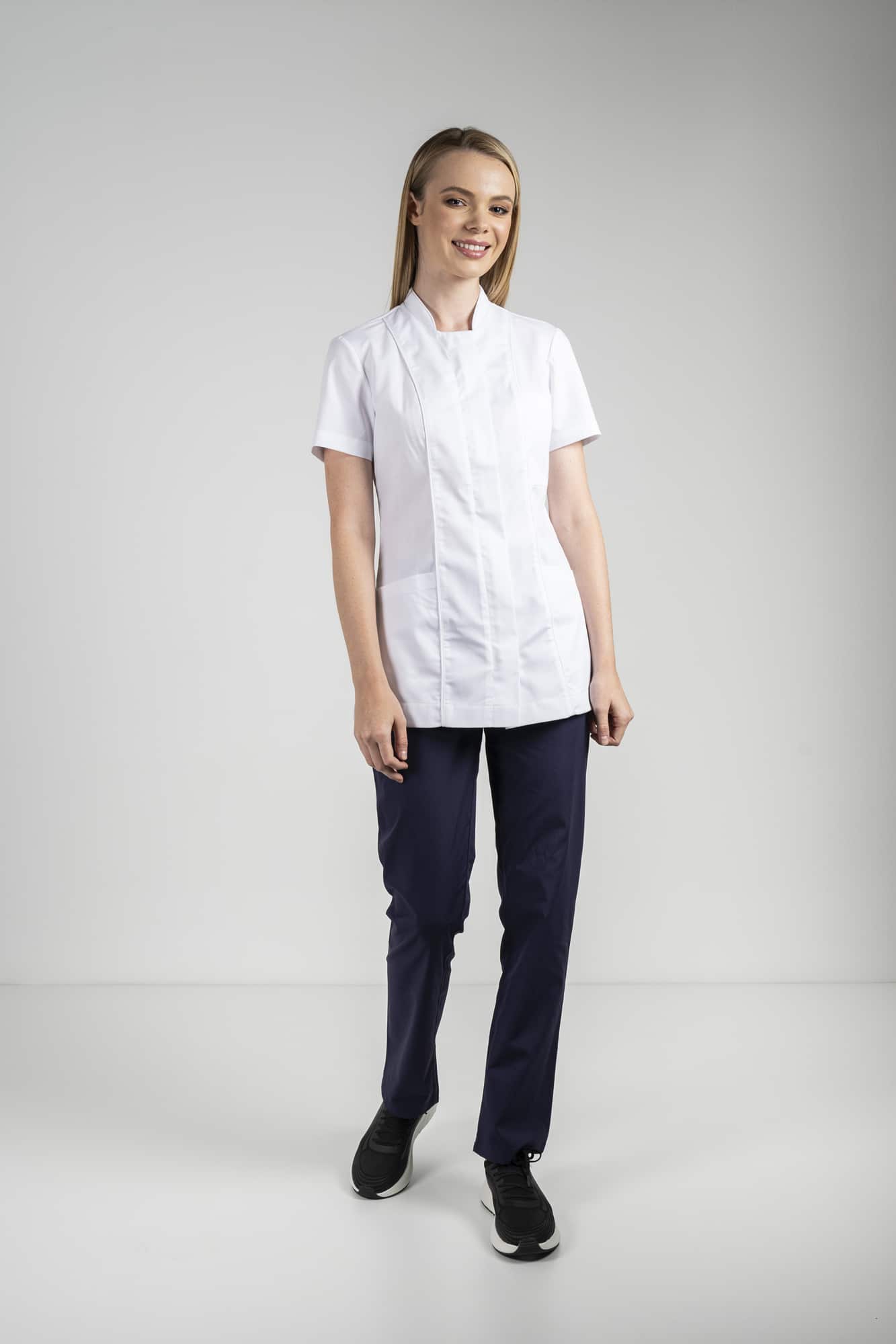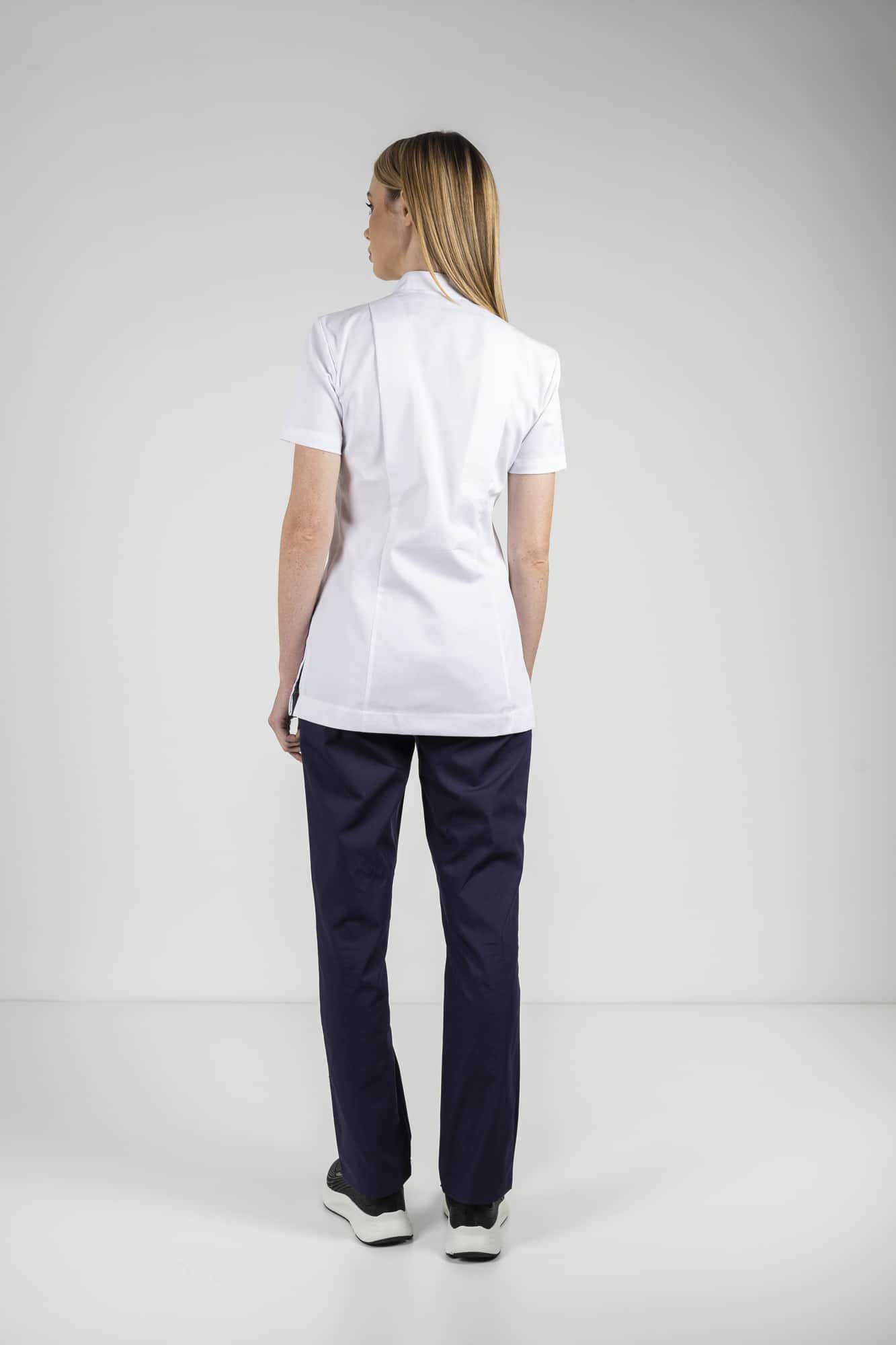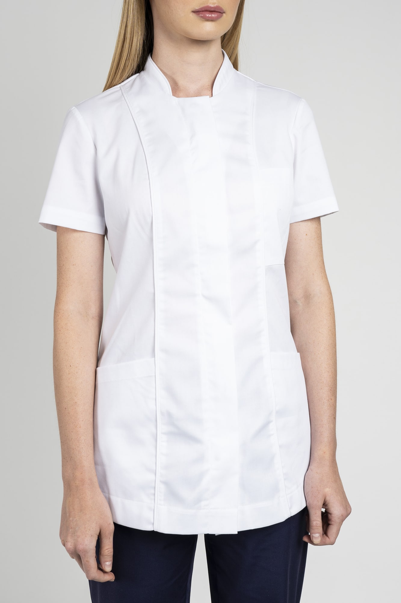 Short sleeve, concealed zip, princess seams with piping. One chest pocket, two lower front pockets.