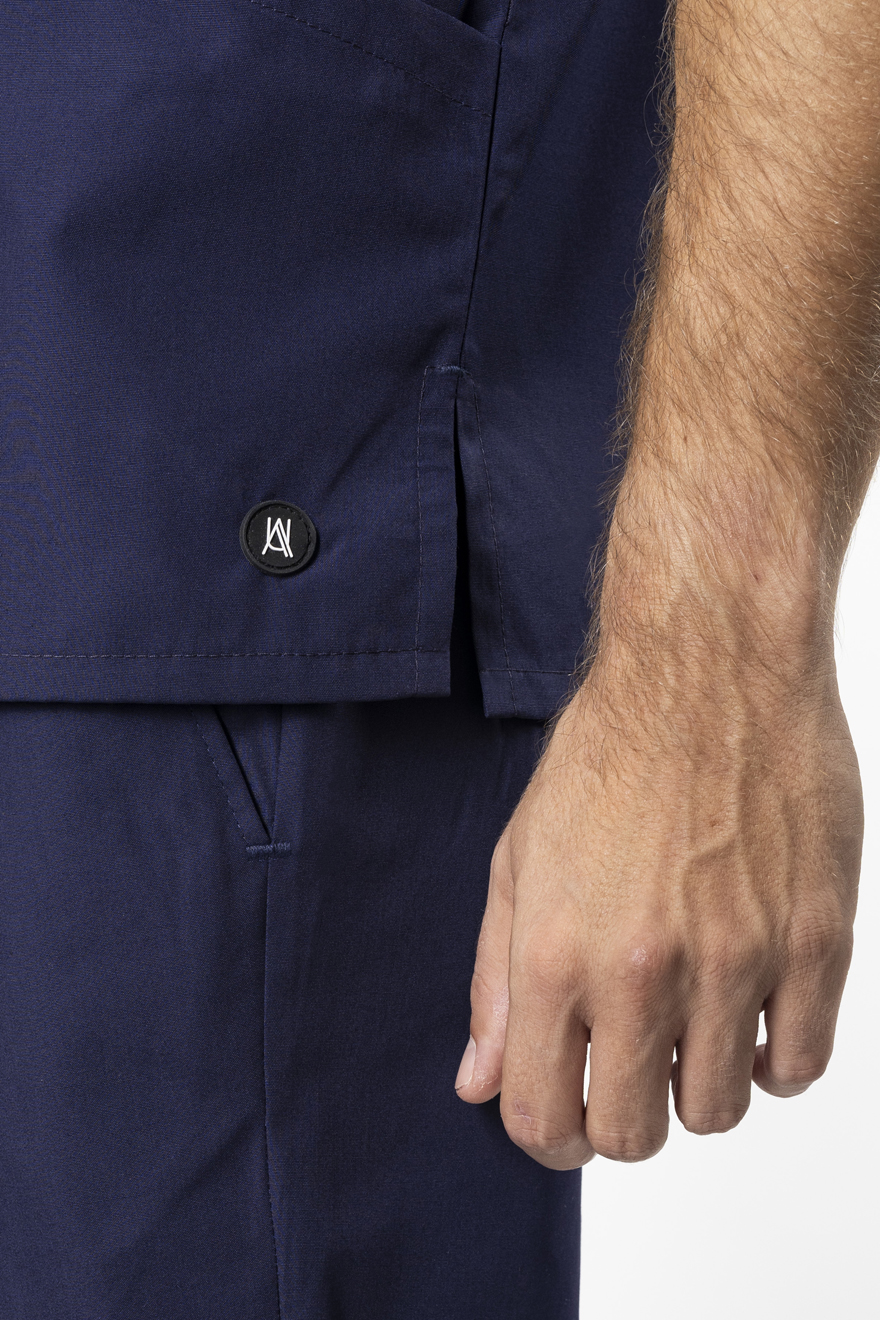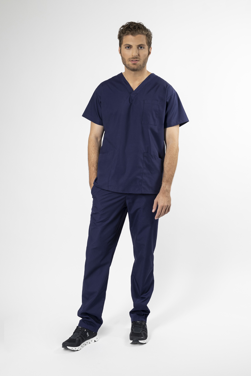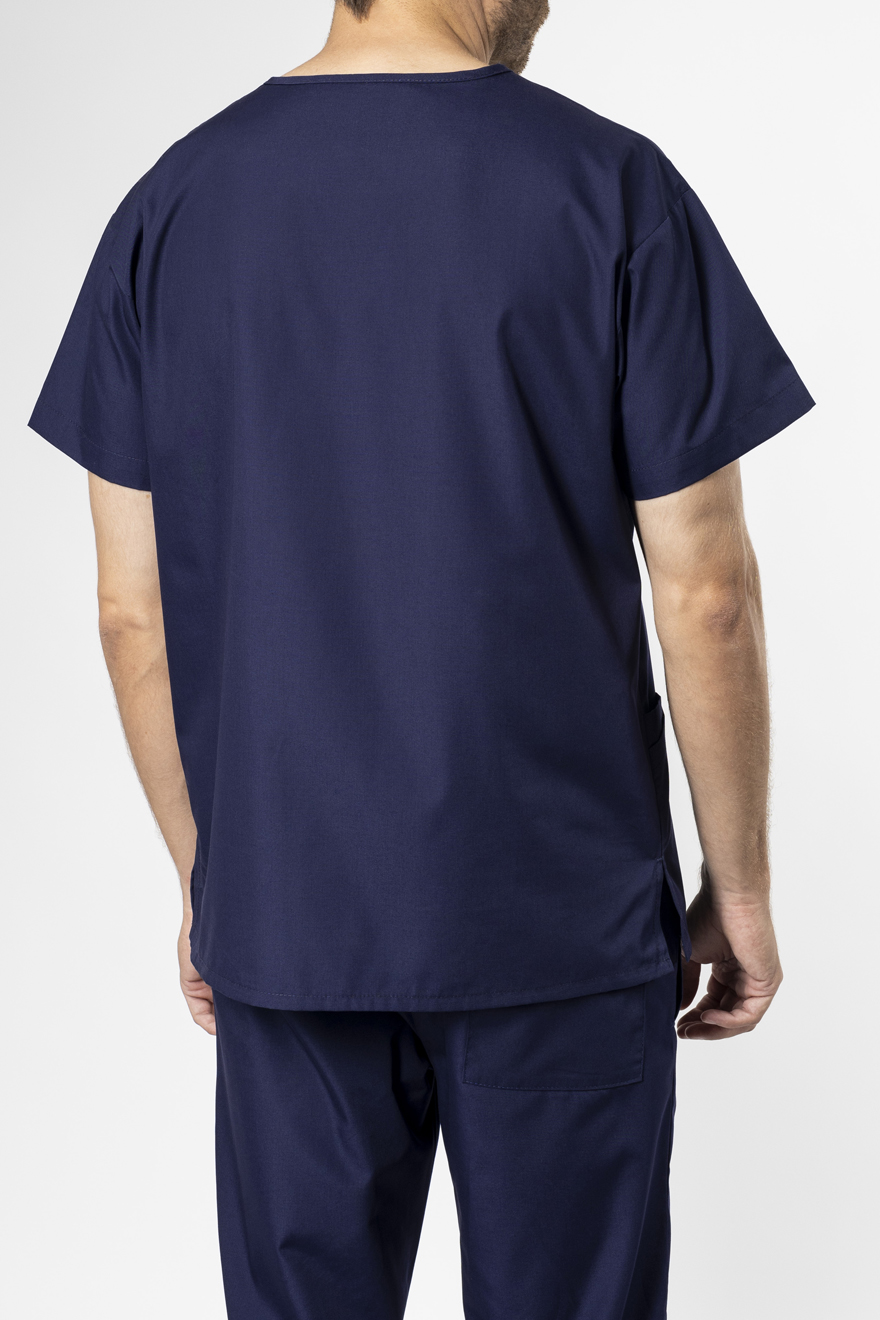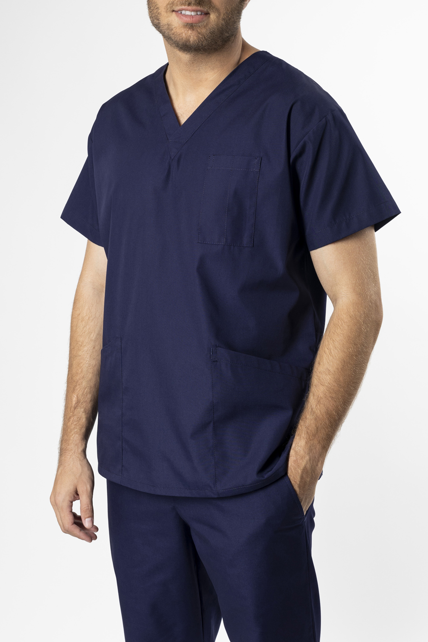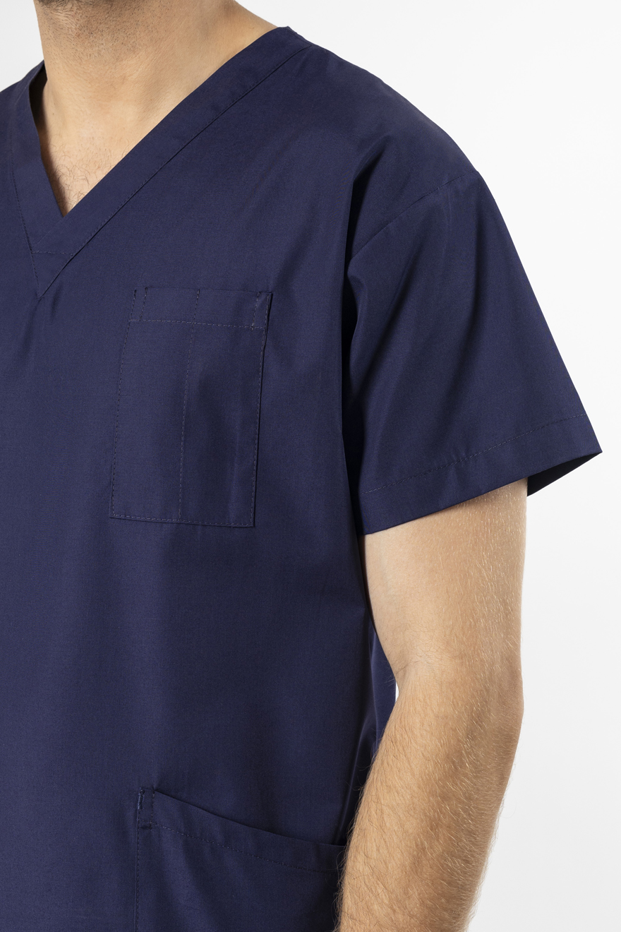 Short sleeve, V-neck scrub tunic. Two lower pockets with divisions.